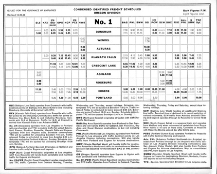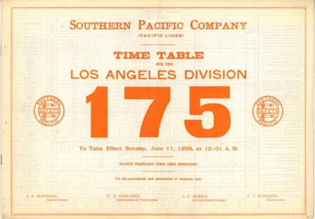 The SP uses timetable notes on the schedule pages to make important trains such as the Coast Daylight superior to other first class train when it was running in the inferior direction. On the cover of the employee timetables there appears a number designation (190, 165, 2, etc.). These are sequential issue numbers, and each Division had its own sequence. Periodically, numbers would restart at 1, generally after some major changes in Division alignments or other important matters which dictated an issue with substantially changed data.