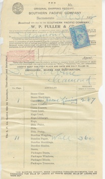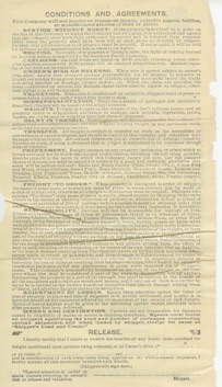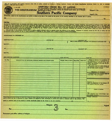 Here is an example of a Memorandum Bill of Lading. This is not the original Bill, but is intended to contain the information of an original, and can be used as a file record. This one is for normal shipper-billed cargo. It was originally green, though edges have faded toward yellow.