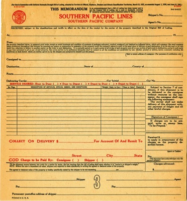 Here is another example of a Memorandum Bill of Lading. This is the companion one for COD freight, (Collection on Delivery). The parts relating to the COD are printed in red. These forms have 1959 printing dates.
