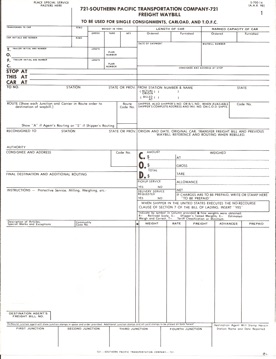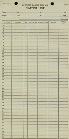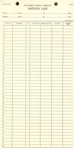 There is no information to indicate the railroad other than the form number in upper right hand corner. Company issued switch lists for the SP, did not list the car type, only the AAR class. The form has a "printing date" along the lower edge.