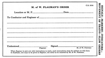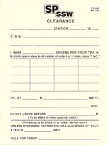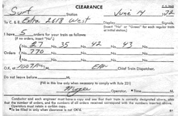 Under the Standard Rules, a Clearance and a Train Order (TO) were two completely separate forms and were never combined into a single form. Once issued, a Clearance allowed a train to depart a station (whether a regular train, or an extra) after a specific date/time.