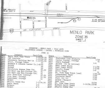 SPINS booklets were published by the railroad and assigned specific numbers to industrial tracks and switching zones. They provide a general arrangement of tracks and industries served. SPINS identified shippers along with including car spotting information on the siding or tracks as required. An example of a couple SPINS pages is below and in the list's Files area, covering a small section of the San Francisco Peninsula, specifically the area around Menlo Park and Palo Alto.