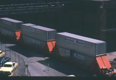 SP #599078 is an F-140-3 blt by ACF in 1968. While built to handle containers. Three photos of SP #599078, one of the drawbar-coupled flats that were the test bed for the SP's articulated double stack cars. http://www.railgoat.railfan.net/spcars/byclass/flat/f140-01.htm